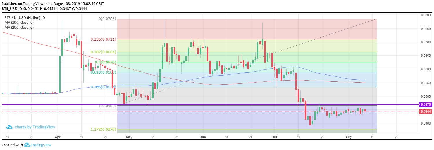 After the most recent failed attempt to close near the highs, the price has started moving lower since June, finally hitting the all-time low of $0.0391 in mid-July. Since then, the digital coin has mildly recovered to current levels, around $0.045.