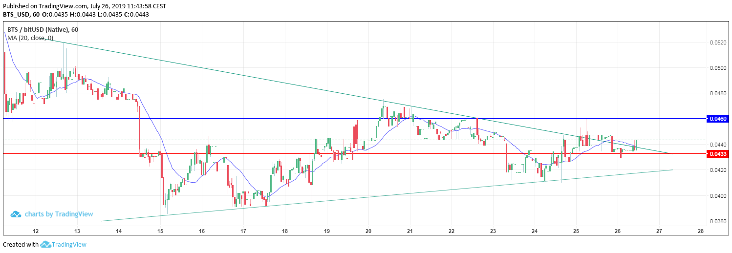 Picture 1 depicts a BTS/USD trading pair on the Sparkdex. As seen in the chart, the technical analysis has shown that the price action is trapped within a symmetrical triangle, (the green converging lines), thus a breakout is imminent. Furthermore, the 20 MA converges with the triangle resistance, creating a resistance block.