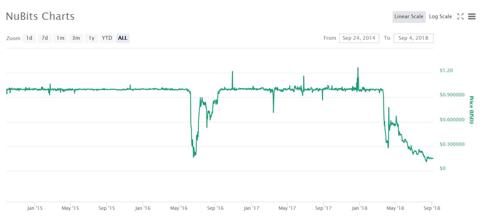 NuBits for example implements algorithmic stability with a two-token model consisting of network tokens and currency tokens, where one is the actual stable coin and the other allows owners to vote for or against monetary policies. Although sound in principle, NuBits collapsed once in 2016 and then rebounded. In March 2018, the coin dropped again and has not recovered since. It doesn’t mean all stable coins in this category are unstable, but it doesn’t help build the case for successful adoption either.